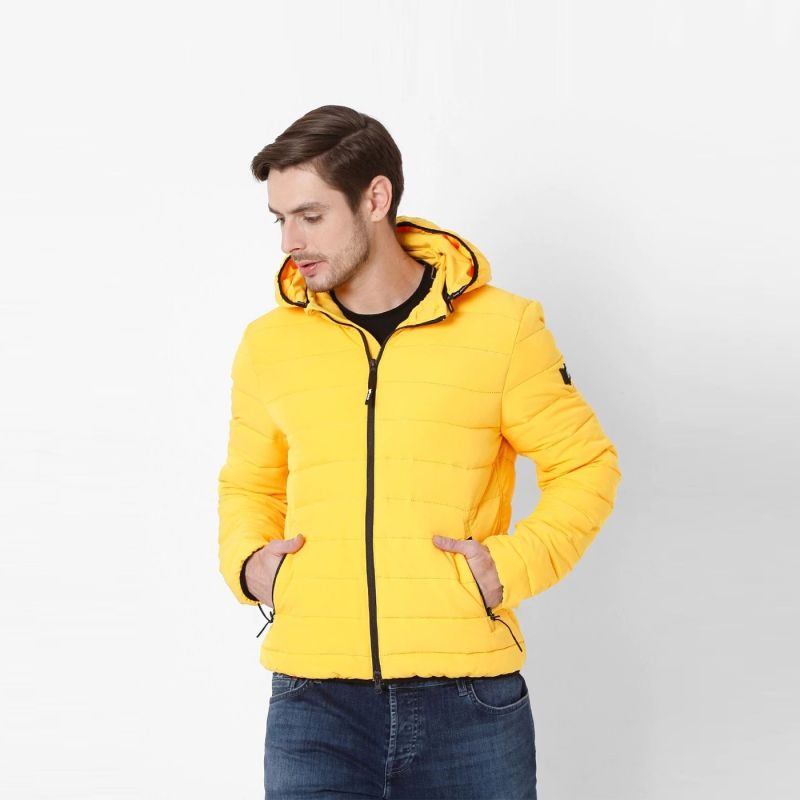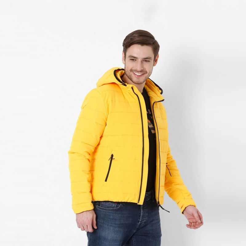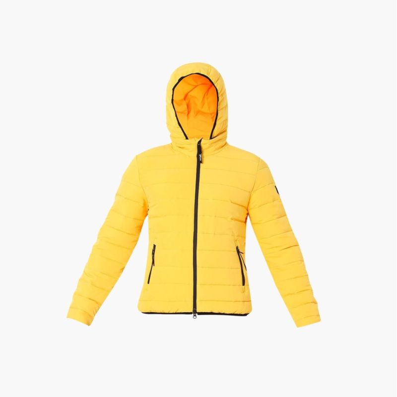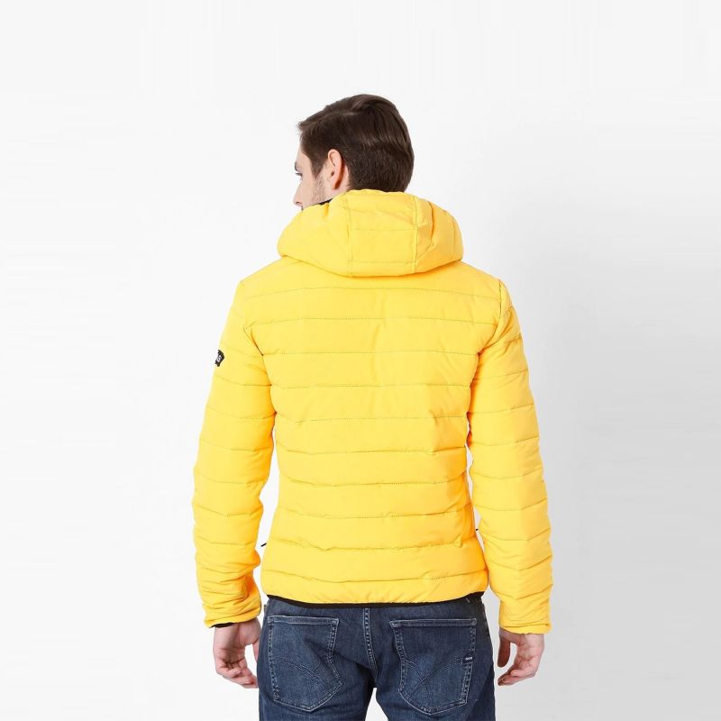 Yellow striped puffer jacket, has a hooded, 2 pockets ,has a zip closure, long sleeves, straight hemline, polyester lining.