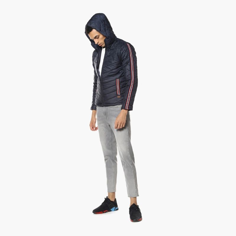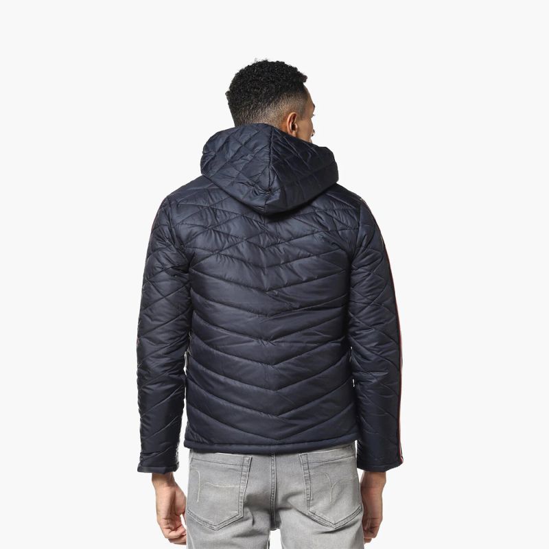 Navy blue geometric self design windcheater quilted jacket, has a hooded, 2 pockets ,has a zip closure, long sleeves, straight hemline, polyester lining.