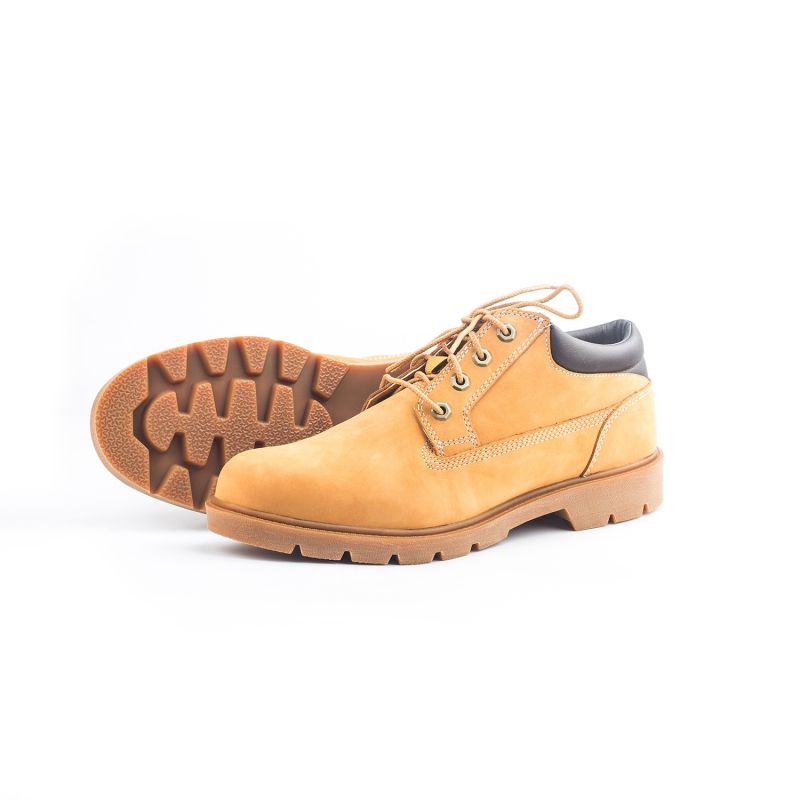 A pair of round-toe Yellow Boots, has regular styling, lace-up detail